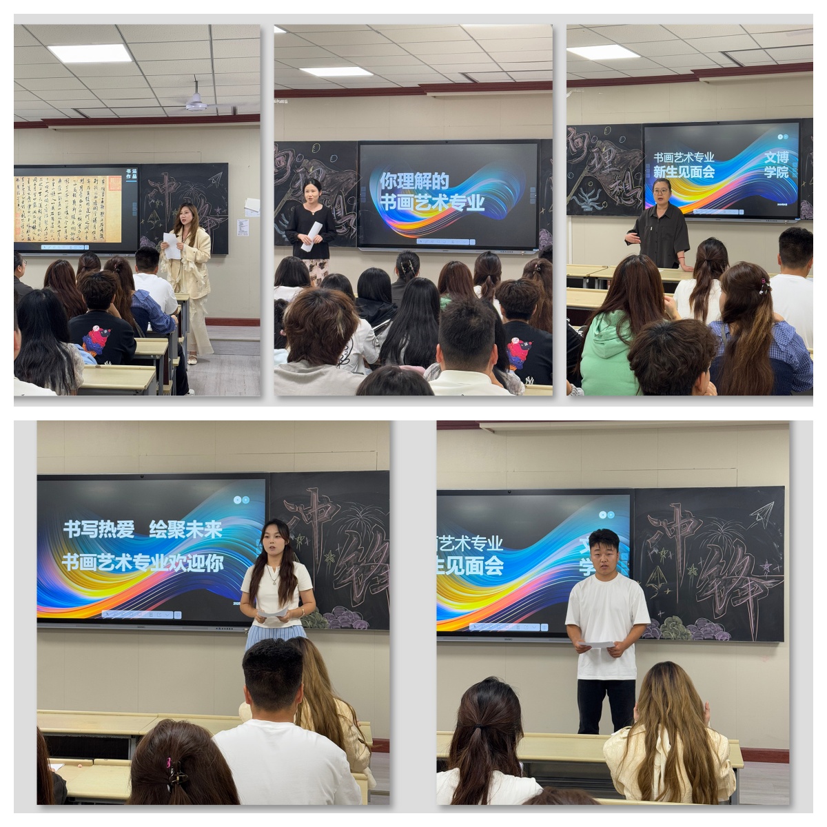 书画艺术专业分为新课试讲和新生见面会两部分。新课试讲聚焦《数字插画》《书法基础》《设计美学》等课程,教师们采用“理论+技法+案例”的教学模式,评审团提出了优化建议,旨在提升教学质量。新生见面会以“书写热爱 绘聚未来”为主题,专业教师杨怡人详细介绍了专业情况,负责人魏宝丽老师强调要“扎实传统,敢于创新”。高年级学生代表分享了宝贵经验,互动环节解答了新生关于学习、就业、实践的疑问,现场气氛热烈温馨。