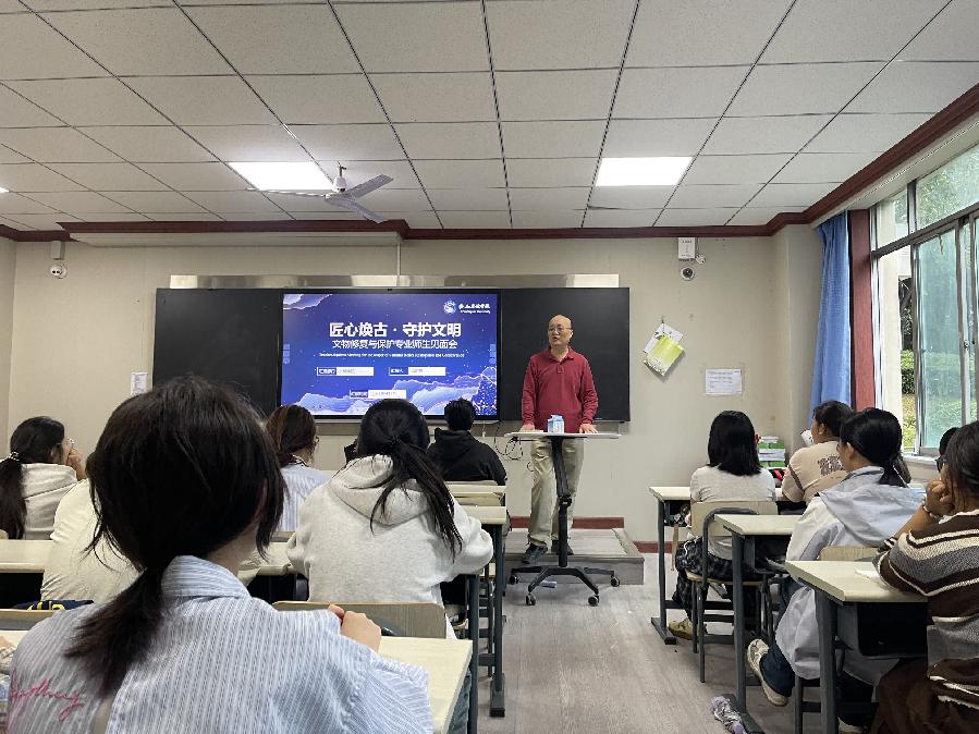 文物修复与保护专业的新生见面会由专业负责人张群喜教授组织开展。他通过详实数据展现了行业巨大的人才缺口和发展潜力,明确了专业“守护文化根脉”、培养复合型人才的定位,并指出数字化保护、绿色修复等新趋势。张群喜教授详细解读了“分层培养、精准赋能”的人才培养方案,包括就业与专升本两大特色选修模块。他还重点介绍了投资巨大、功能分区明确(陶瓷、书画、金属石质修复区及保存库房)的在建文保实验室,令新生充满期待。