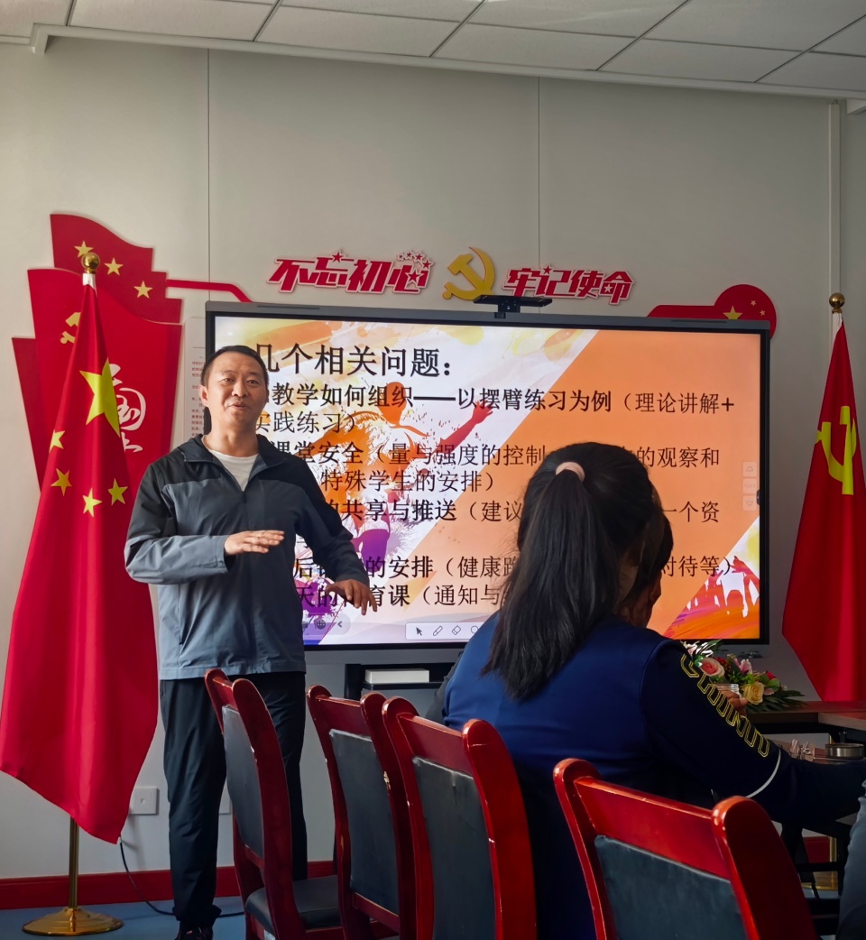 在教学实践指导环节,张辉副院长针对课堂安全、课后锻炼安排、特殊情况应对等关键问题提出具体要求,课堂上需严格控制训练量与强度,密切观察学生状态,对特殊体质学生制定个性化方案;课后需落实“健康跑”等锻炼要求,兼顾不同学生运动水平差异。同时,结合《大学体育Ⅰ》课程思政设计要求,建议教师在准备活动、太极拳教学等环节融入思政元素,培养学生良好的意志品质。