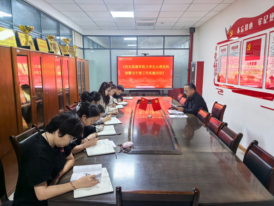 2025年9月26日,为积极响应学校号召,进一步加强学生心理健康管理工作,大数据管理学院组织全体学工人员集中学习了《西安思源学院大学生心理危机预警与干预工作实施办法(修订版)》,并对后续相关工作进行了全面而细致的部署。会议由学院二级辅导站站长王晓妍老师主持,此次会议不仅提升了学院学生心理健康工作的专业水平,更为保障学生健康成长奠定了坚实基础。
