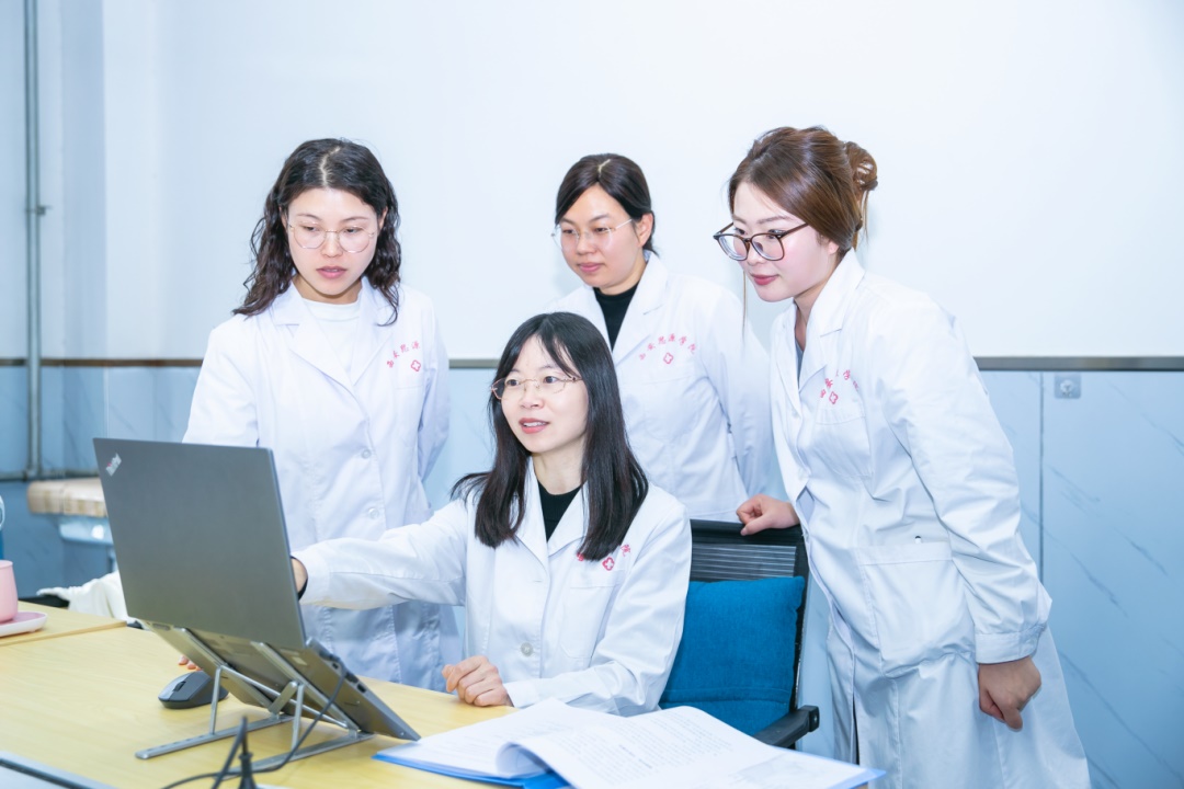 科研优秀工作者、医学院教研室主任吴玉洁副教授(前中)与科研团队成员进行专题研讨