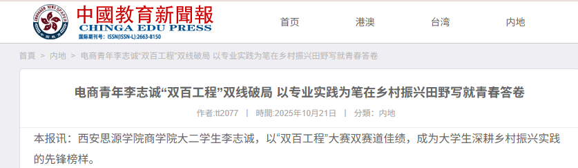 中国教育新闻报:电商青年李志诚“双百工程”双线破局 以专业实践为笔在乡村振兴田野写就青春答卷