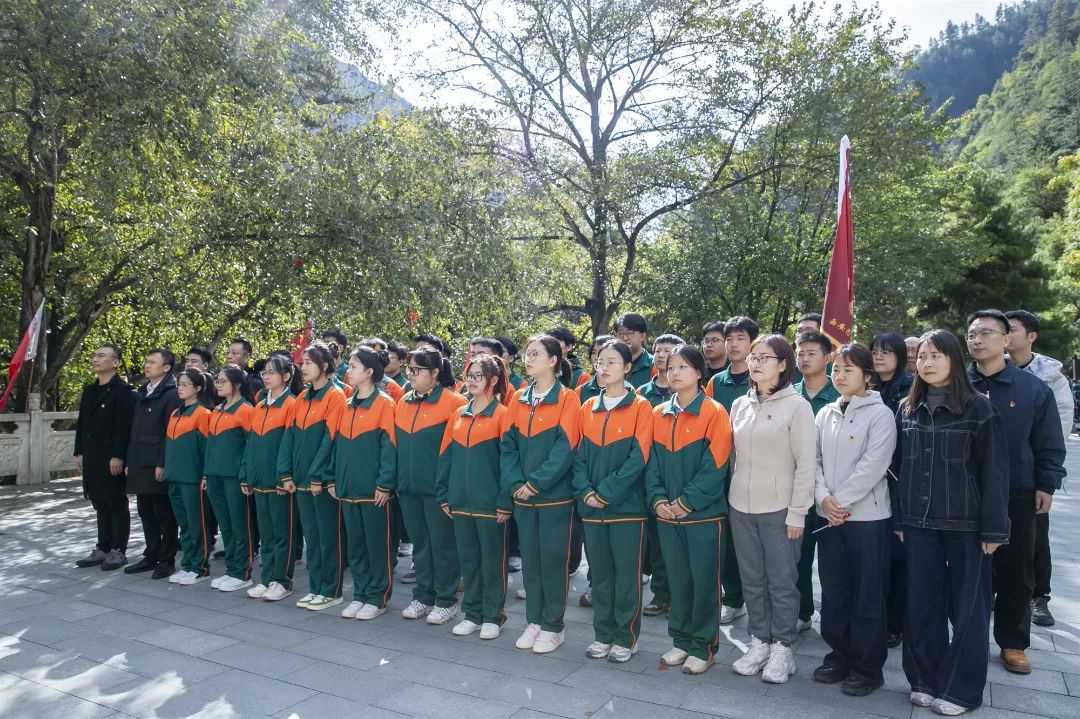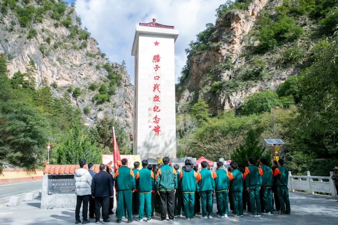 在腊子口战役纪念碑前,师生们集体向革命先烈默哀并敬献花篮,表达深切缅怀