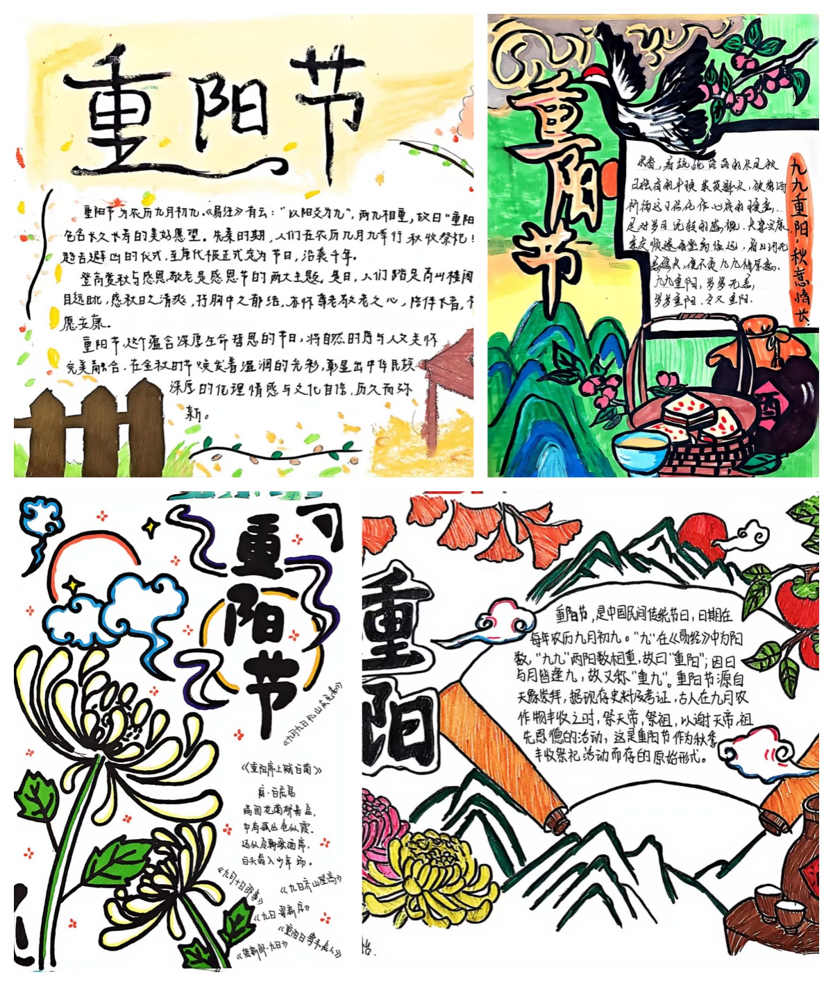 创作过程中,同学们充分发挥创意,将传统元素与现代视角巧妙融合:有的以水墨风格勾勒祖孙相伴的温馨场景,题字“岁岁皆安康”传递美好祝愿;有的用鲜明色彩绘制菊花、仙鹤等吉祥图案,搭配重阳节诗词典故,尽显文化韵味;还有的聚焦“银发关怀”,在手抄报中加入智慧助老小贴士,将敬老情怀转化为具体行动指南。