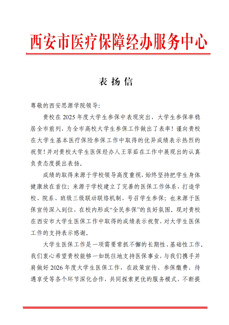 近日,西安思源学院收到来自西安市医疗保障经办服务中心的表扬信,信中对学校在2025年度大学生参保工作中取得的优异成绩给予高度肯定,称赞学校大学生参保率稳居全市前列,为全市高校大学生参保工作树立了良好榜样,同时对学校大学生医保经办人王翠茹认真负责的工作态度提出表扬。