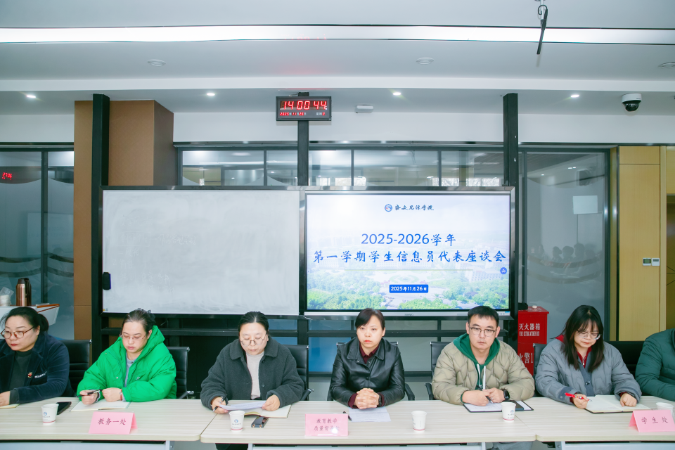 为进一步落实学生信息员制度,及时收集学生反馈信息,深入了解学生需求与成长状况,保障教育教学工作规范有序运行,持续提升教育教学管理质量。2025年11月26日下午,教育教学质量督导处在图书馆智慧教室204组织召开了2025-2026学年第一学期学生信息员代表座谈会。教育教学质量督导处、教务一处、教务二处、学生处相关职能处事领导老师出席会议,来自各二级学院不同专业年级的48名学生信息员代表参加会议。座谈会由教育教学质量督导处质量监控科邢丹秋老师主持。