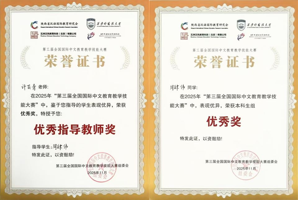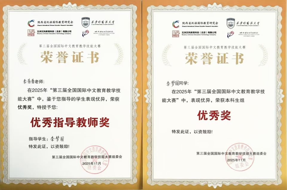 2025年11月22日,全国第三届国际中文教育教学技能大赛在西安外国语大学举办。西安思源学院文学院经过初赛选拔,选派组织学生参赛并安排专任教师指导。汉语国际教育专业李梦圆、张可欣、周肆伟三名学生荣获大赛本科生组优秀奖,李蓓蕾、姜行、许芸青三位老师荣获优秀指导教师奖。