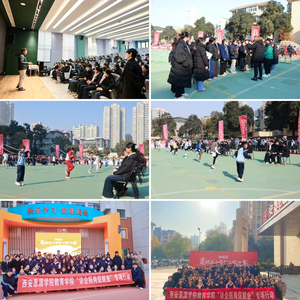 2025年12月5日,由西安市莲湖区教育局指导、西安莲湖锦园小学主办的2025年西安市青少年三跳比赛在莲湖赛场顺利举行。教育学院积极响应赛事号召,遴选65名优秀学生志愿者组建专项服务团队,在带队老师指导下,圆满完成赛事计时、计数、判罚等关键工作,以专业素养与责任担当为赛事保驾护航,其卓越的校风校纪与志愿服务精神获主办方高度赞誉。
