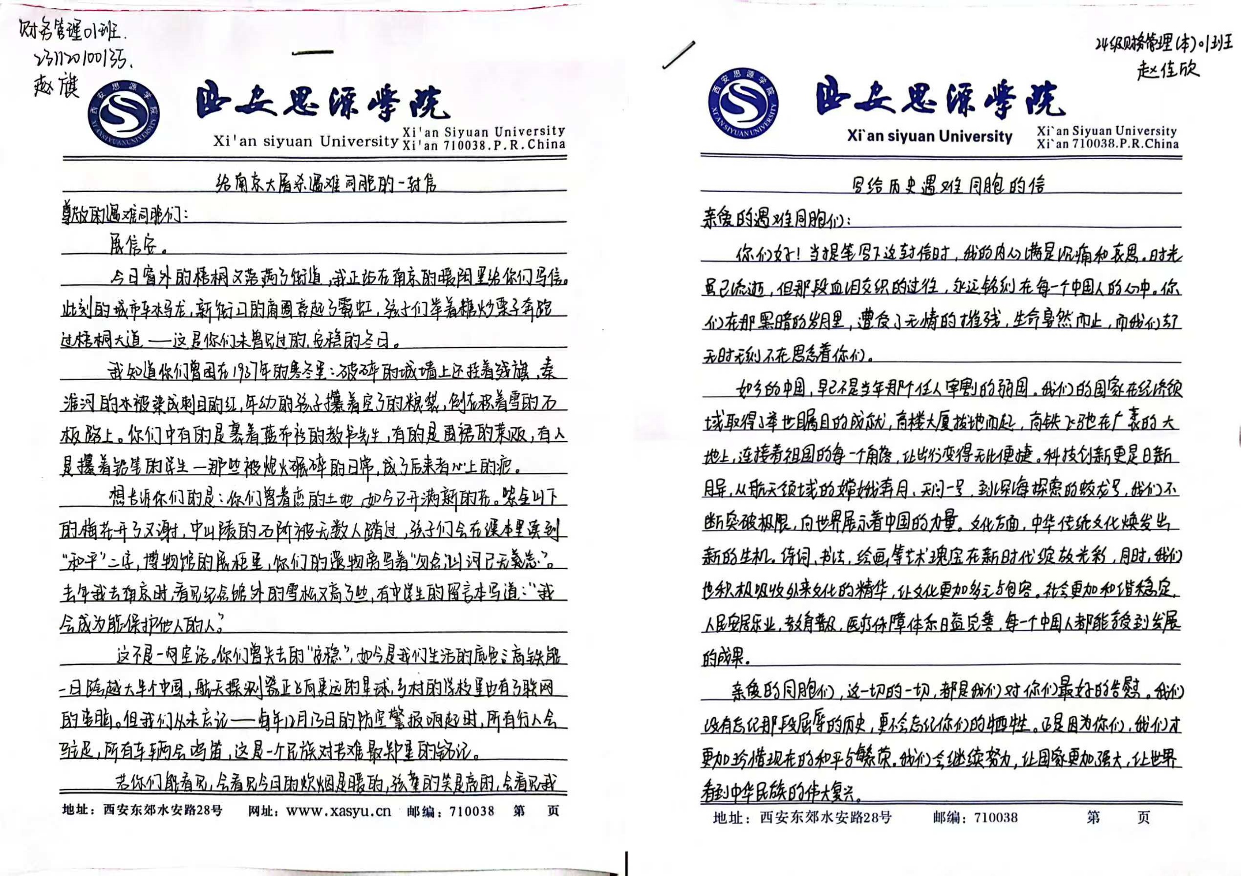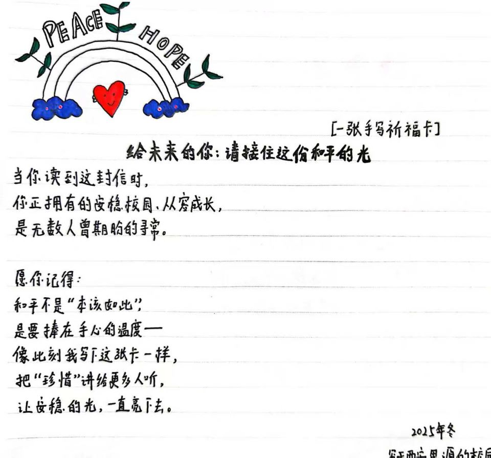 “时空邮箱”活动为学子们提供了一个静心沉思、对话古今的情感空间。同学们提笔凝思,或向历史深处的同胞寄去无尽缅怀与告慰,或向革命先烈表达崇高敬意,亦或向未来许下关于责任与和平的庄重诺言。一封封书信跨越时空,承载着真挚情感与深沉思考。