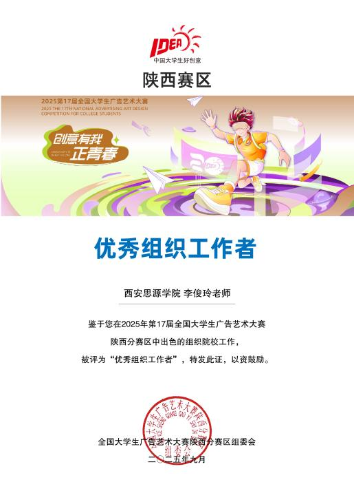 在个人荣誉方面,文学院传媒系李俊玲老师、夏子崇老师凭借在赛事联络协调、过程精细管理及学生指导服务中的出色表现,被评为 “2025 年度优秀组织工作者”,他们的辛勤付出为学校参赛工作的顺利开展提供了坚实保障。