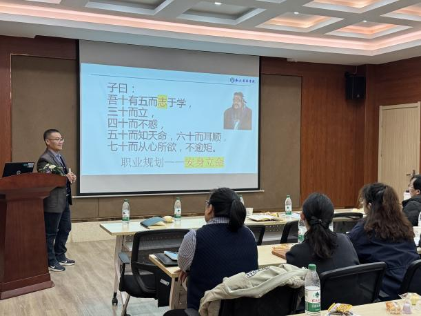 随后,王维荣副教授针对下学期即将开设的《职业规划》课程进行了说课和课堂展演。王老师首先对课程整体情况进行了全面说明,接着对每个章节的重点内容进行了细致讲解。最后,针对“自我探索 - 性格”章节进行了精彩展演。王老师幽默风趣的教学风格,赢得了每一位培训教师的高度肯定,现场气氛热烈。