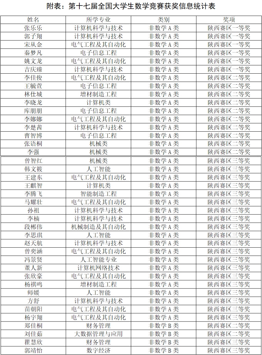 近日,由中国数学会主办的第十七届全国大学生数学竞赛陕西赛区获奖名单揭晓,我校学子斩获佳绩,共揽获40余项省级奖励,充分展现了扎实的数学功底与出色的学科竞争力。