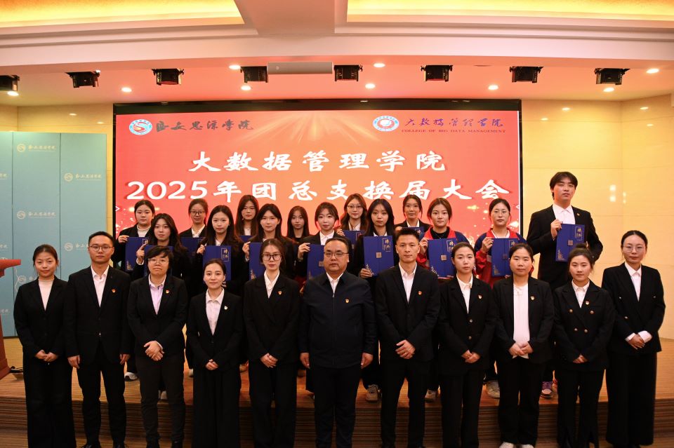 大会尾声,参会领导与新一届团总支学生干部合影留念,定格下这一意义非凡的时刻。此次换届大会的圆满召开,为学院团总支注入了新鲜血液、焕发了全新活力。未来,大数据管理学院团总支将以此次换届为契机,持续强化组织建设、深耕品牌活动,推动团学工作再攀新高,为学院高质量发展贡献青春智慧与力量。(供稿/大数据管理学院)