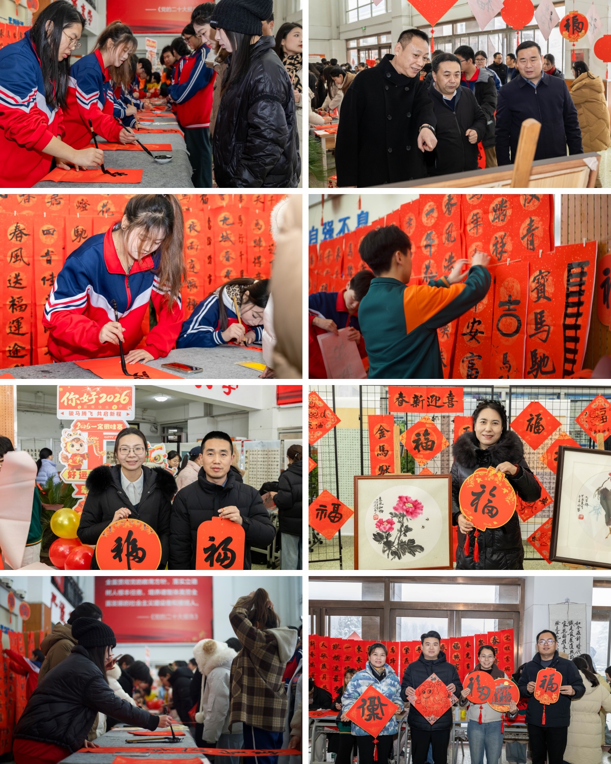现场写福字、送春联环节将现场气氛推向高潮。书法学、书画艺术专业学生们凝神运笔,在红纸上书写饱满有力的“福”字与意蕴祥瑞的春联。这些作品承载着对新年的美好祝愿,传递出“福运连绵”“春满人间”的传统寓意。现场氛围热烈,师生们在墨香中交流心得,共同感受传统文化的魅力。
