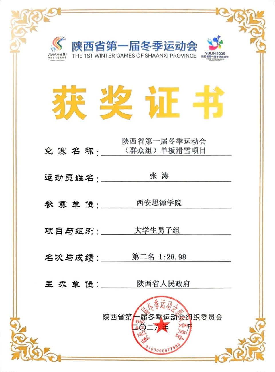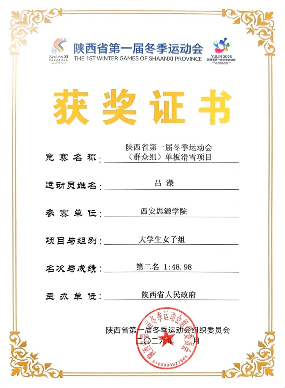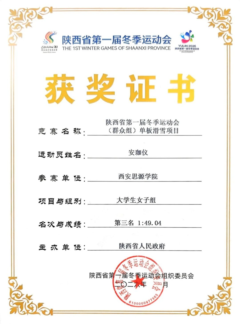 西安思源学院代表队获陕西省第一届冬季运动会群众组单板滑雪团体总分第一名