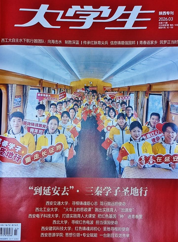 近日,由北京市委宣传部指导、前线杂志社主办的《大学生》杂志2026年3月陕西专刊正式出版。在“到延安去”·三秦学子圣地行专题中,我校教育学院撰写的《思想引领+专业赋能,一台剧目双效并举》一文被成功刊发,文章题目荣登本期杂志封面,充分展现了学校思政育人工作的创新成果与良好社会影响。