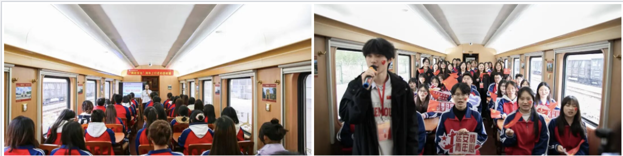 研习之旅在青春洋溢的合影环节中启程,一张张青春面孔,写满对精神原乡的向往。列车飞驰,车厢化身为“移动思政课堂”——马克思主义学院曹静漪老师结合中国近代史脉络与延安革命精神,为同学们深情讲述红色征程,让信仰力量在青春旅途上生根发芽。《保卫黄河》的激昂旋律与党史故事的深情讲述交织,让奔赴延安的旅途成为领悟延安精神的第一课。