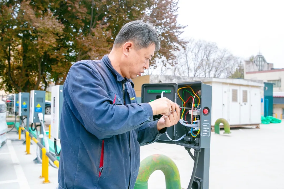 水电暖维护处工作人员检查北停车场充电设施运行情况