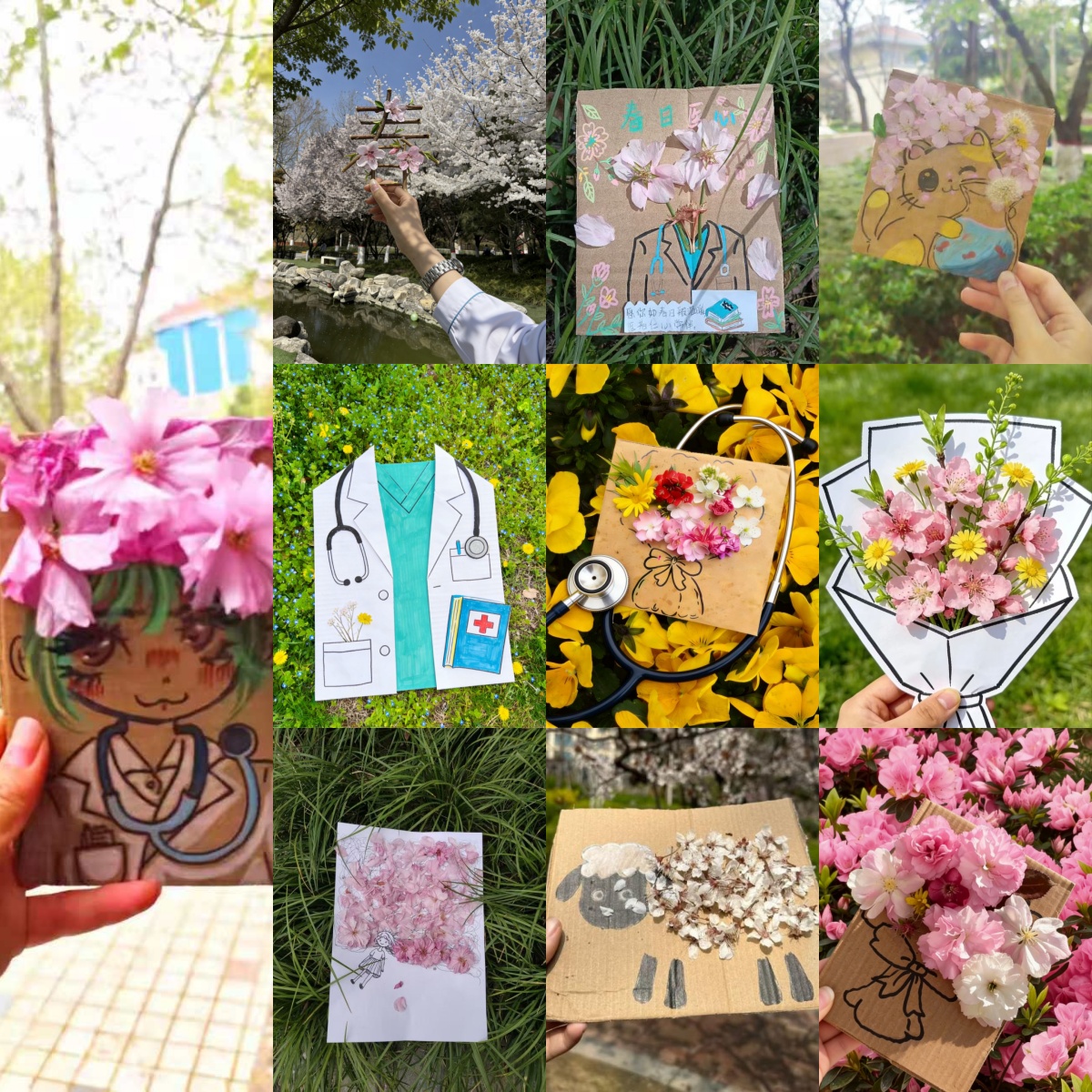 本次活动鼓励同学们立足日常、就地取材,用身边易获取的材料解锁春日创意,感受手工创作与摄影记录带来的心理疗愈。大家可收集硬纸板、卡纸等常见物品,或是捡拾校园中自然掉落的花瓣、枝叶,发挥想象力与创造力,制作春日贺卡、创意摆件、花草拼贴画等手工作品。同时,活动特别倡导同学们融入专业特色,将白大褂、听诊器等医学元素,或是简约生动的医学简绘巧妙融入作品之中,让春日的生机与医学的温暖相撞,既展现青春创意,也传递医者初心。