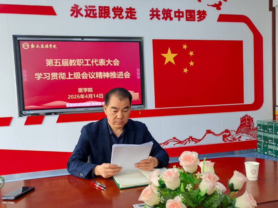 为迅速贯彻落实学校第五届教职工代表大会暨第五届工会会员代表大会(以下简称“双代会”)精神,统一思想,明确目标,4月14日上午,医学院在中336会议室召开中层干部及专业负责人专题会议,传达学习学校“双代会”精神,重点研讨周延波校长工作报告及学校“十五五”发展规划。医学院院长、党总支书记、各教研室主任、专业负责人及行政科室负责人参加了会议。