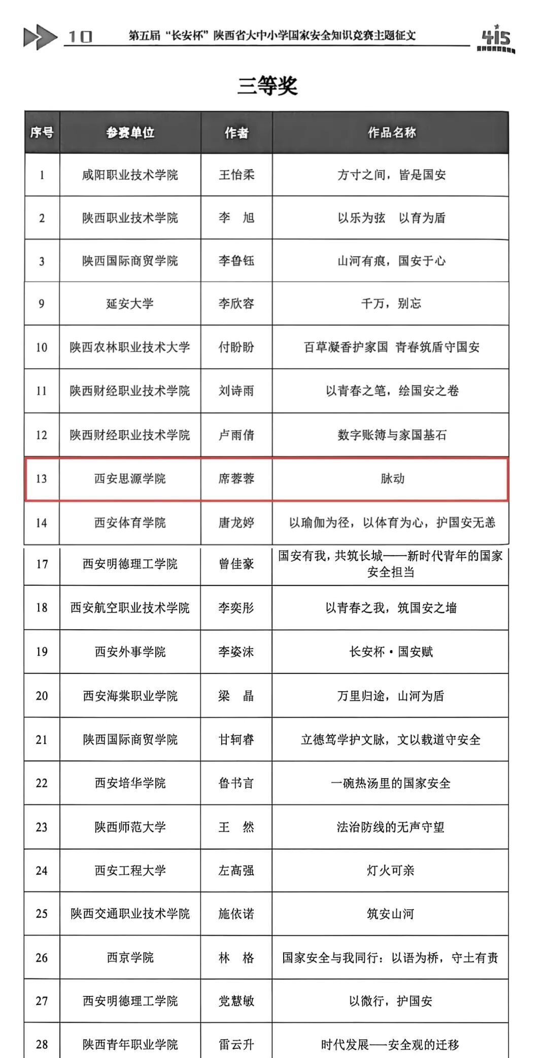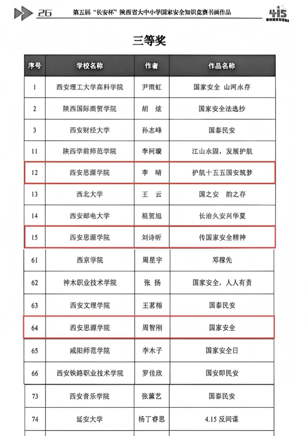 在由省委国安办、省委教育工委、省教育厅、省国家安全厅联合主办的第五届“长安杯”陕西省大中小学国家安全知识竞赛中,我校高度重视、广泛动员,组织师生积极参与网络答题、主题征文、书画作品、教学视频征集等系列活动,荣获主题征文二等奖一项三等奖一项,主题书画二等奖一项三等奖两项,充分展现了思源学子扎实的国家安全知识素养与昂扬向上的精神风貌。