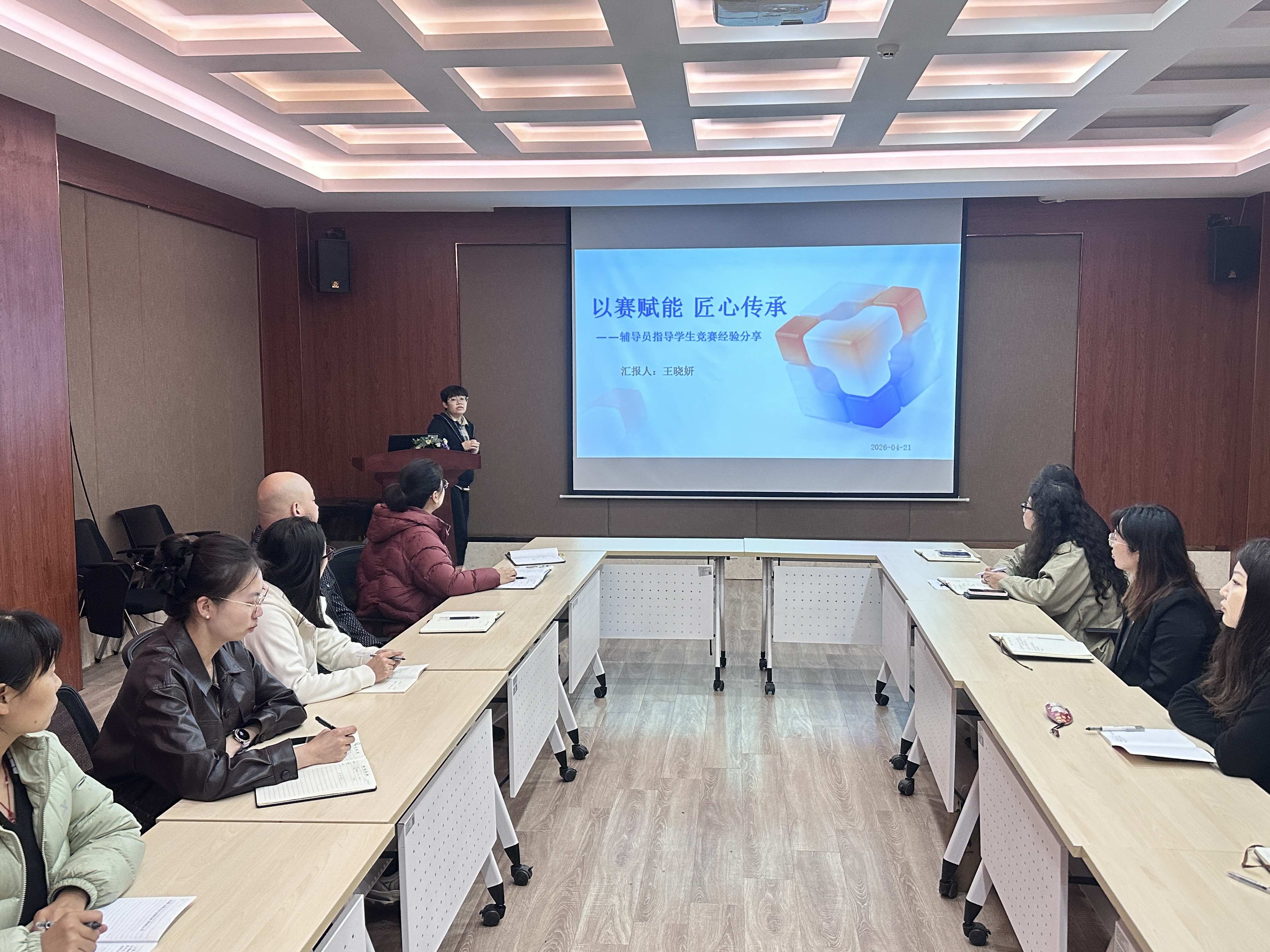为进一步提升辅导员竞赛指导专业能力,强化育人实效,促进工作室成员经验互鉴、共同成长,2026年4月21日,“三叶草” 辅导员工作室“以赛赋能、匠心传承”主题分享会在大学生创新创业训练展示中心群英汇会议室成功举办。工作室主持人陈建甫老师主持活动,工作室骨干成员王晓妍老师担任主讲嘉宾,为全体成员带来一场干货满满、实用性极强的竞赛指导专题分享。