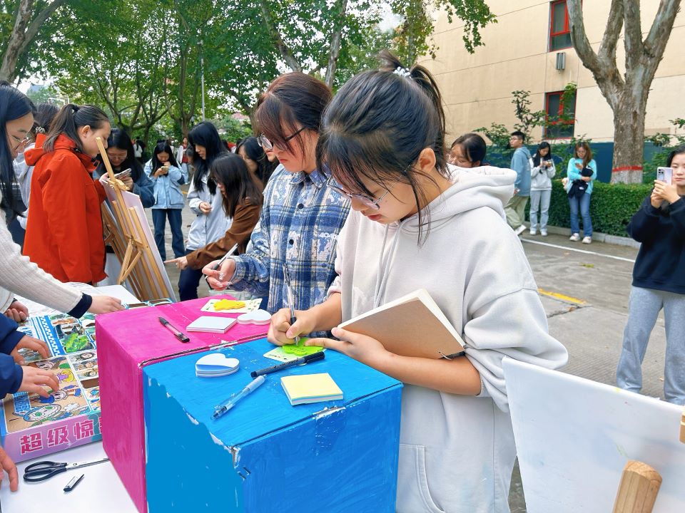 最具温情的当属“情绪交换盲盒”环节。现场摆放着两个情绪盲盒,一个用于投放“消极情绪”,学生可匿名写下近期的烦恼、焦虑或开心的小事;另一个则装满了“积极情绪”,学生也可匿名把自己开心的事投进情绪箱。参与学生可互相抽取纸条,在匿名交换中实现情绪共鸣与互助。