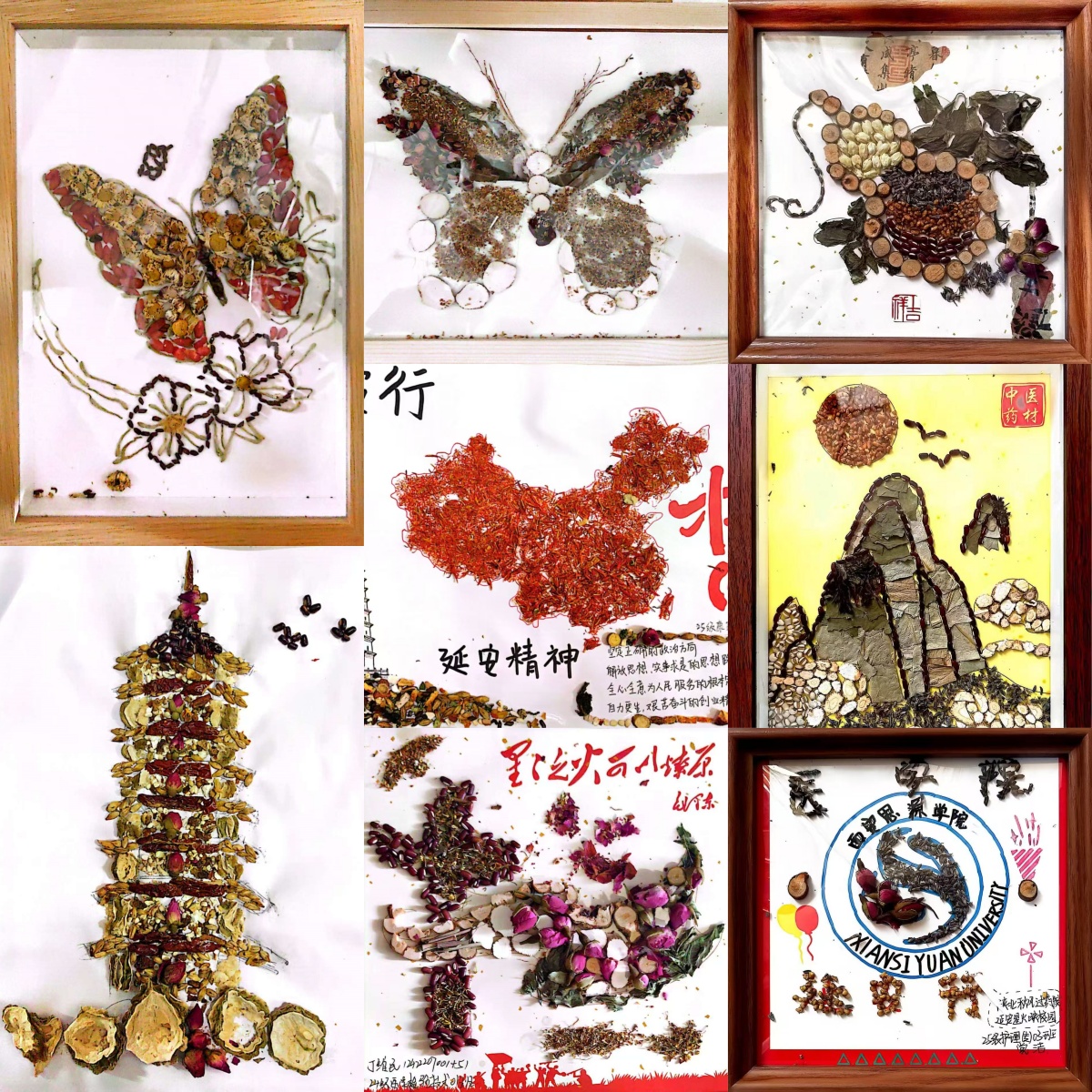 在活动过程中,同学们通过制作药材艺术创作作品,主体部分采用真实的中医药材拼贴、镶嵌或拓印构成;创作主题紧紧围绕“山水意境”、“花鸟生灵”、“人体经络”、“经典医方”或“健康生活”等方向自由发挥;将个人创意与中药材进行结合,创作出精美绝伦的作品。其中不少作品聚焦延安研学中的红色记忆,成为活动亮点。同学们以“宝塔山”为创作核心,用深棕的决明子铺就山体,象征革命圣地的厚重底蕴,以鲜红的红花、枸杞勾勒塔身,寓意红色信仰的炽热鲜活,再现了“双手搂定宝塔山”的赤子情怀。每一幅画作既成为传递青春担当的“时代答卷”,也成为传承红色基因的“生动教材”。