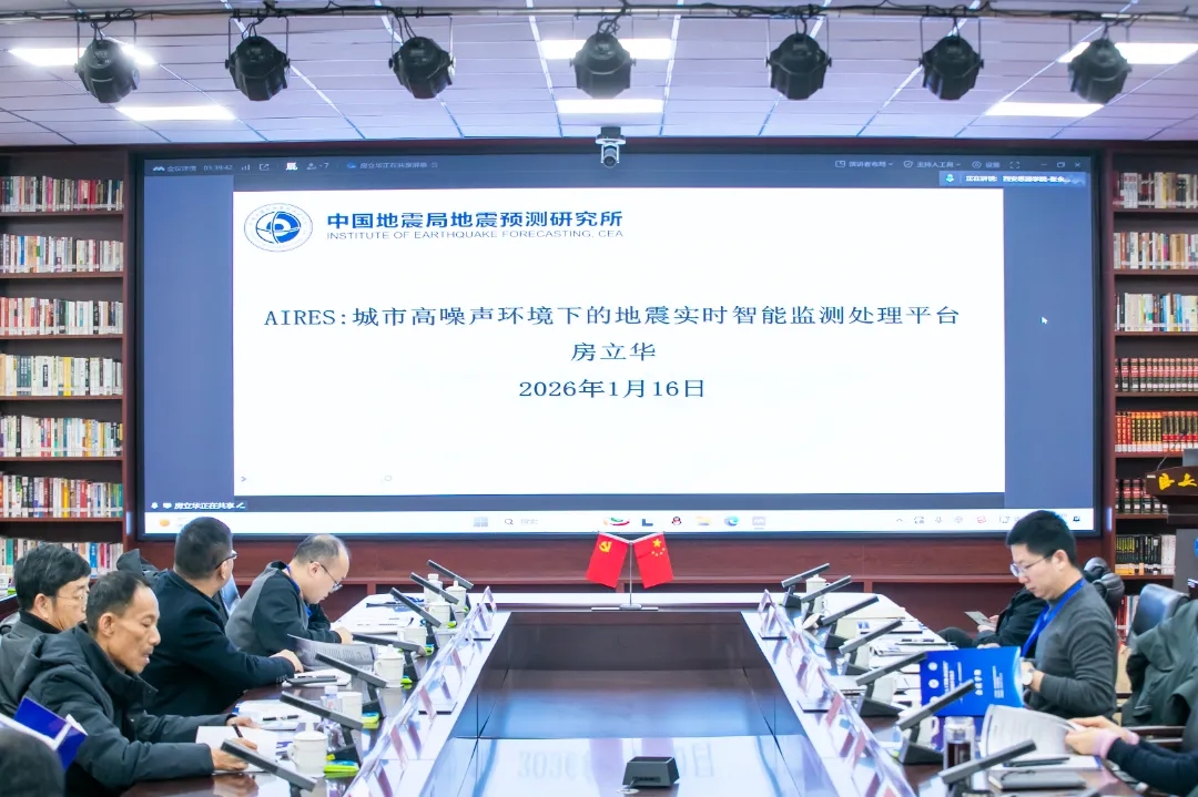 中国地震局地震预测研究所副所长房立华研究员作题为《AIRES:城市高噪声环境下的地震实时智能监测处理平台》的报告