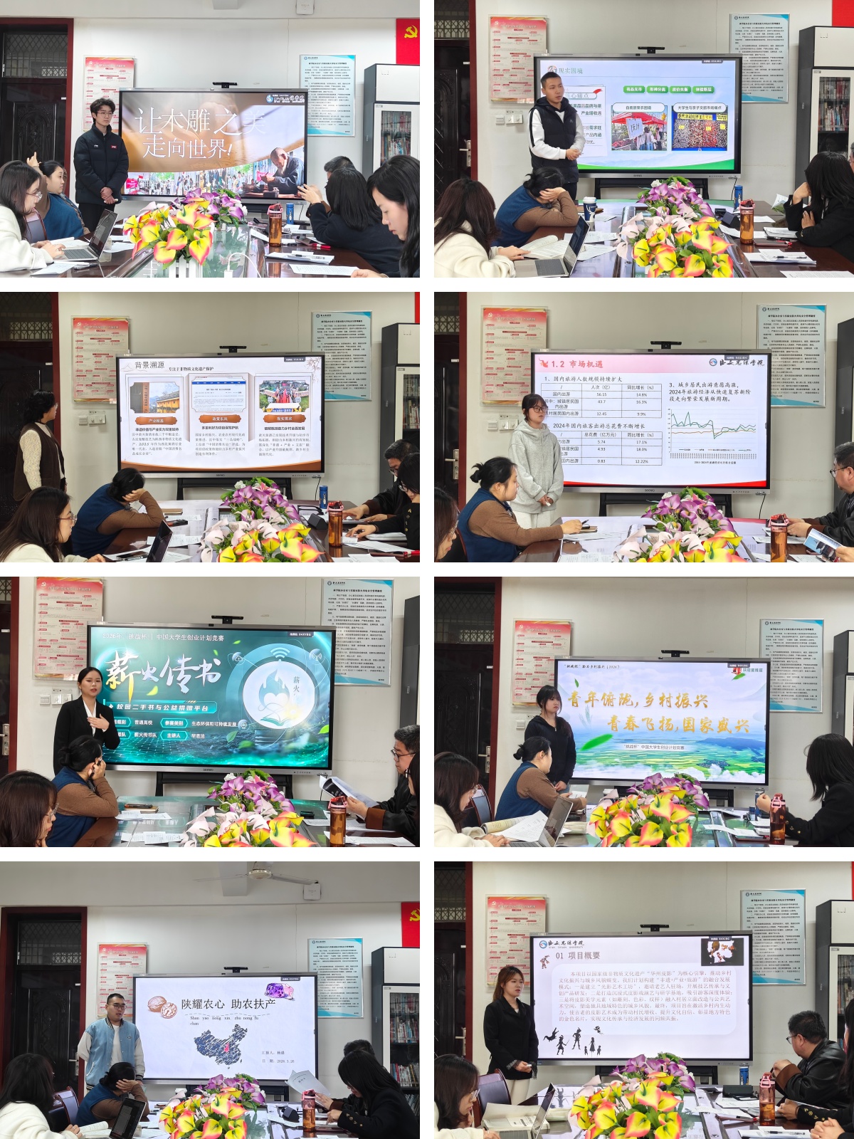 本次入围的8个项目涵盖乡村振兴、文化传承、绿色低碳等多个领域,充分体现商科学子扎根中国大地、回应时代命题的责任担当。其中,“薪火传书”项目致力于优秀文化的传承与传播;“原上烙丰年”聚焦乡村特色产业发展;“蒲坂木雕”生“火”短视频雕琢的零碳文创项目将非遗技艺与绿色理念有机融合;“陕耀农心”“三色文旅·赋能米脂”“青春焕陕味,乡土耀好货”等项目立足陕西本土资源禀赋,探索农文旅融合发展新路径;“秦巴醉韵——黄酒织就乡村振兴锦绣卷”以传统黄酒产业为切口,展现乡村振兴的生动实践;“皮影江湖,华洲秘室”则将非遗皮影与现代传播手段相结合,赋予传统文化新的表达方式。各项目选题立意鲜明、调研扎实深入,彰显了商学院学子知行合一、服务社会的学术追求与创新精神。