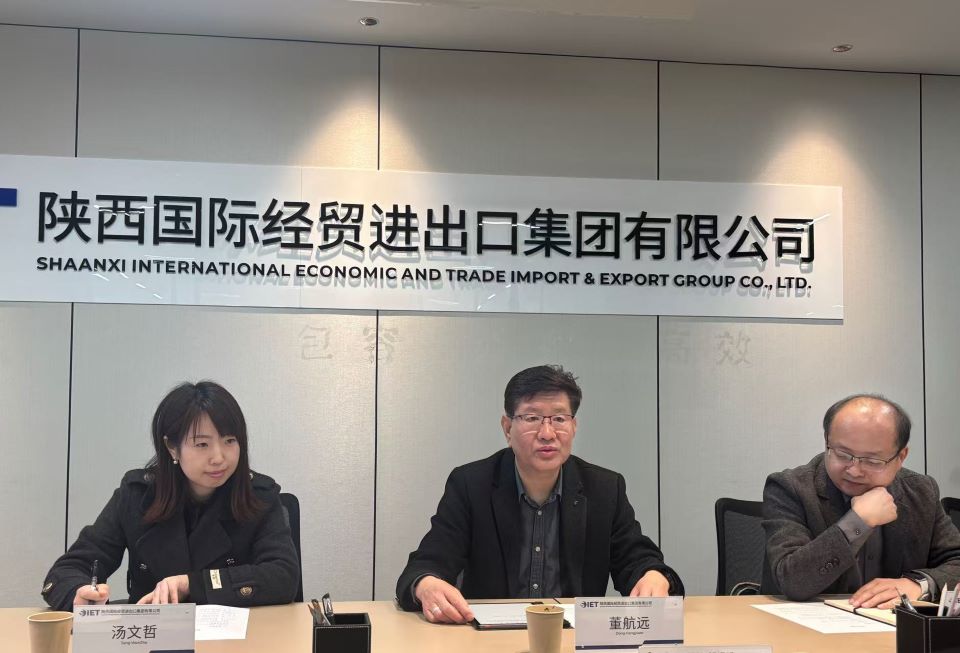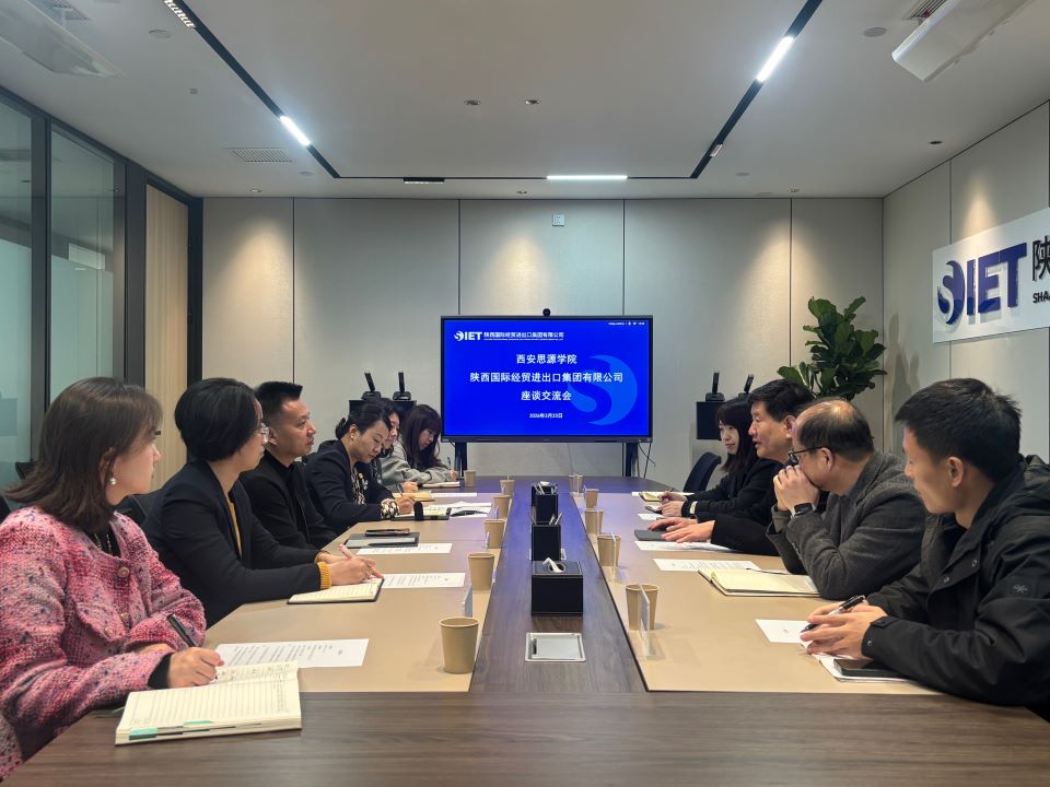 为深入推进校企合作,精准对接企业用人需求,拓宽毕业生就业渠道,落实访企拓岗专项行动工作要求,2026年3月23日14时,西安思源学院校长助理董航远带队,大数据管理学院党总支书记、院长彭彬战,党总支副书记、副院长汤文哲及毕业班辅导员王卫冬、李娜一行赴陕西国际经贸进出口集团有限公司开展访企拓岗交流洽谈。陕西国际经贸进出口集团有限公司党委书记、董事长苗谦,党委副书记、副总经理、工会主席韩雅萍,副总经理刘昌菊,经济运行部部长延玮,组织人事部部长彭圣男热情接待了校方一行,双方在公司第一会议室举行座谈。